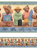 Faixa de parede com desenho de ursinhos caracterizados como turistas de diferentes estilos, disponível nas larguras de 18 cm, 25 cm e 35 cm, em rolos de 1,2 metros de comprimento, com encaixe perfeito da imagem nos pontos de emenda, de modo que montadas as faixas parecem uma peça contínua