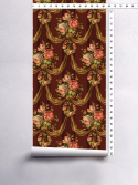 Papel de parede adesivo com estampa floral de rosas estilo vintage em tons de dourado e vermelho granada, ideal para decoração de salas, quartos e outros ambientes