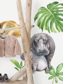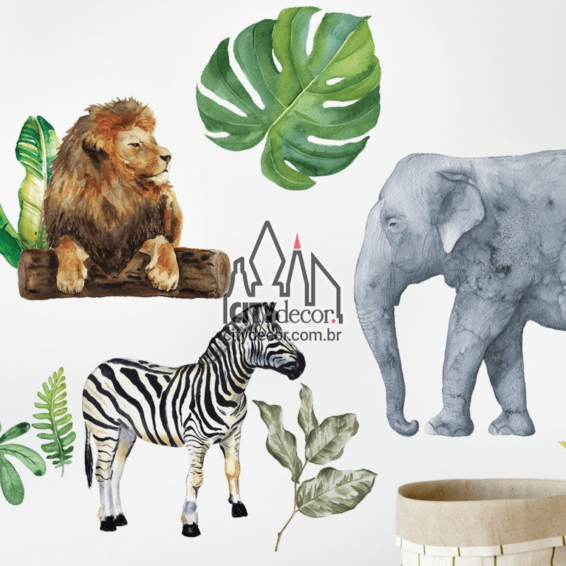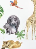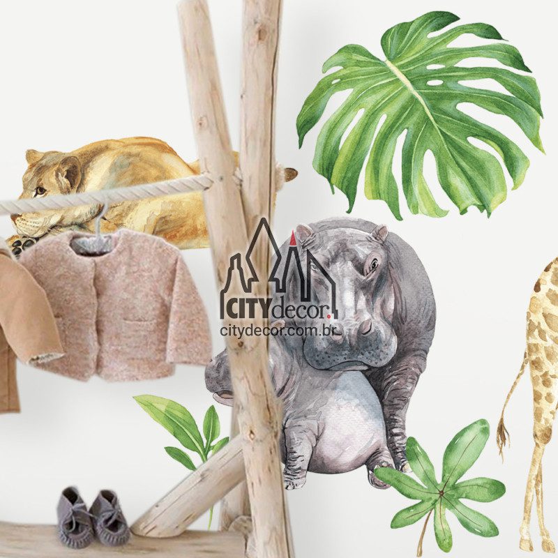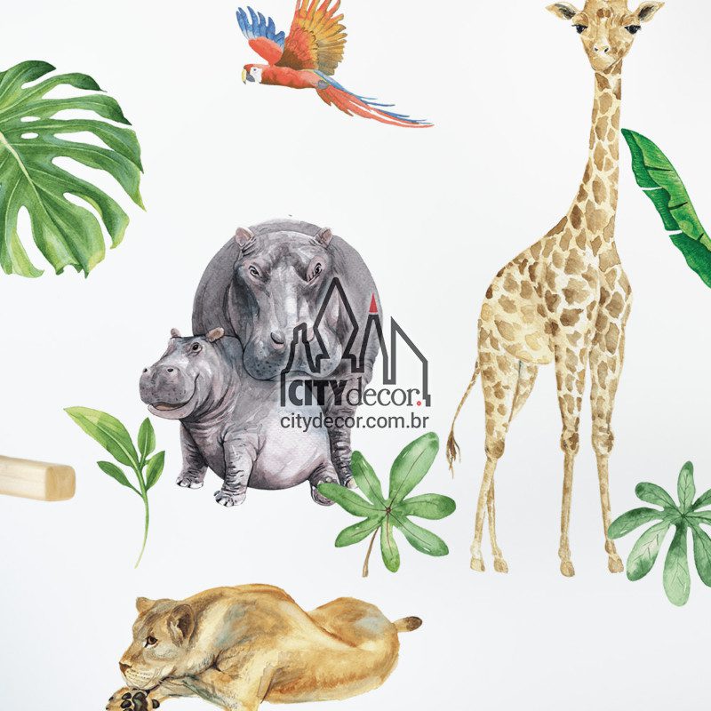Crie um visual lúdico e inspirador com este lindo kit adesivo de parede de bichos do safári! Leão, elefante, girafa, zebra, arara e hipopótamo com filhote figuram entre folhagens exóticas. Todos os itens são separados para montar conforme sua preferência