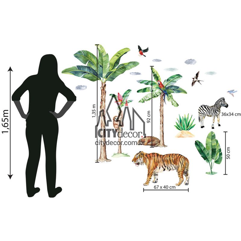 Crie um visual inspirador no seu ambiente com este lindo kit adesivo de parede de animais na selva! Zebra, tigres, bicho preguiça e pássaros coloridos figuram entre árvores e folhagens. Todos os itens são separados para montar conforme sua preferência