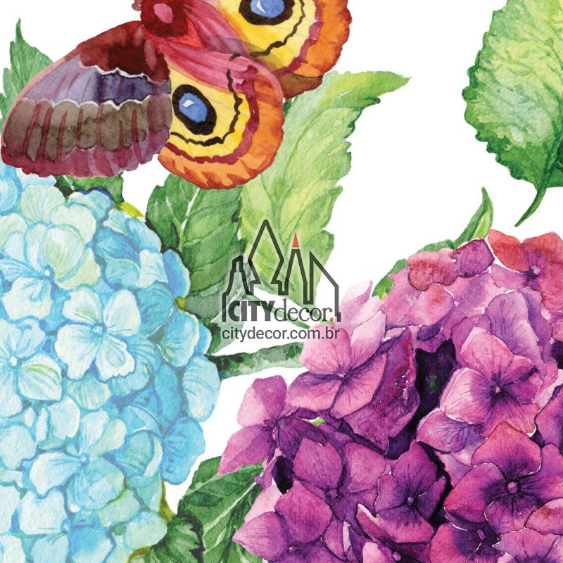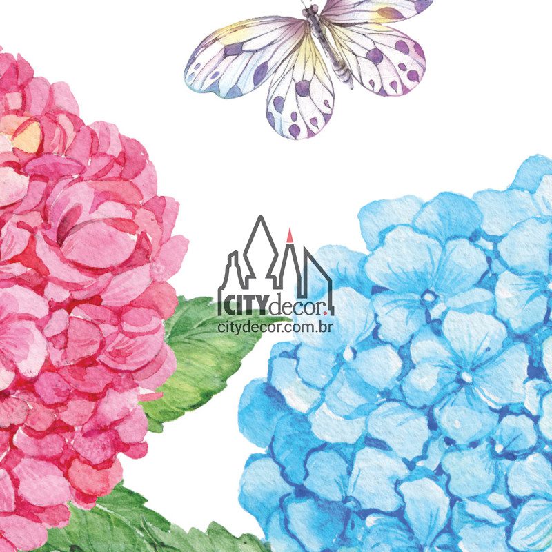 ➭ Conteúdo do kit: 7 buquês de hortênsias, 9 folhinhas e 2 borboletas, todos recortados isoladamente para separar e montar conforme seu gosto