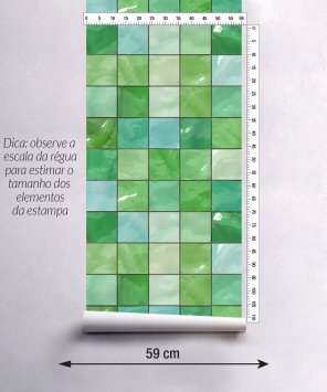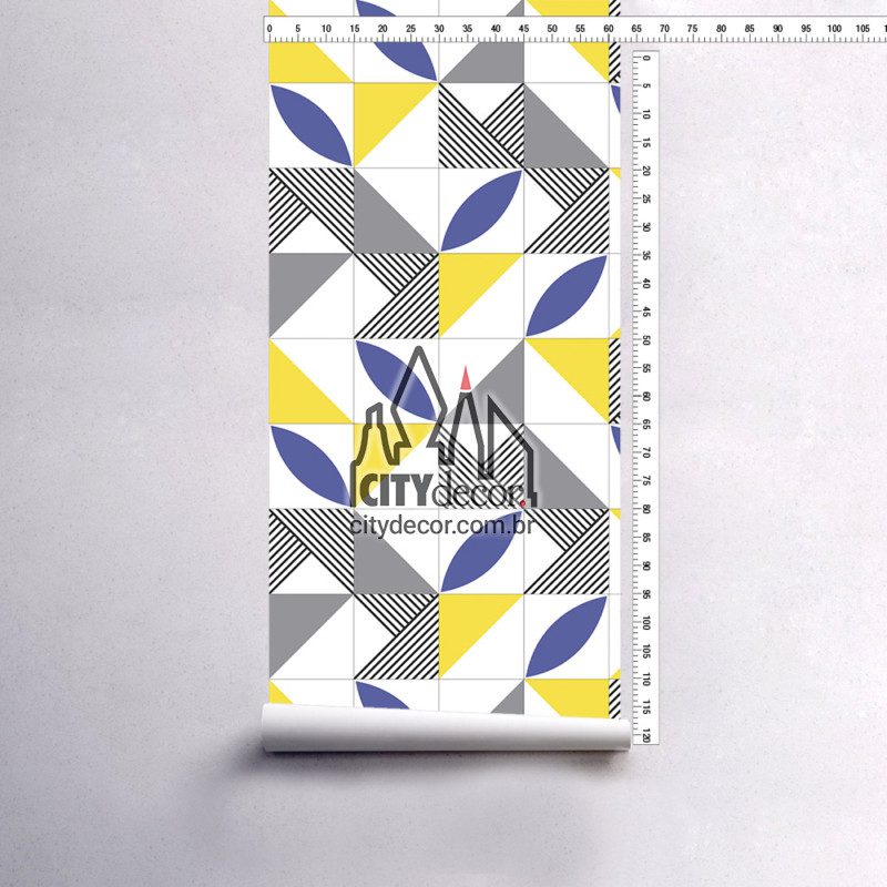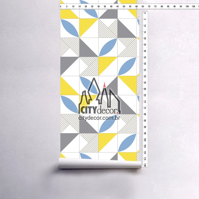 Papel de parede com estampa de azulejos estilo geométrico, inspirado na paleta da cor do ano Pantone 2021 – amarelo e cinza, simbolizando força e positividade. Disponível em duas opções de cores, com azulejos nos tamanhos 10 cm, 15 cm e 20 cm, para escolher conforme sua preferência