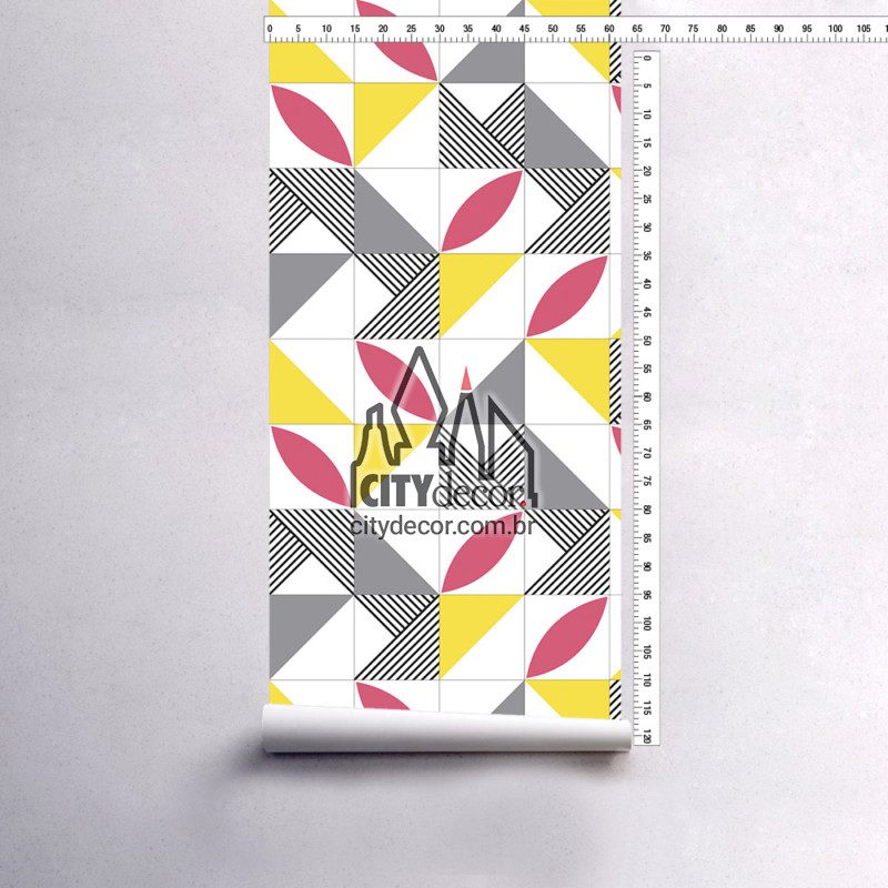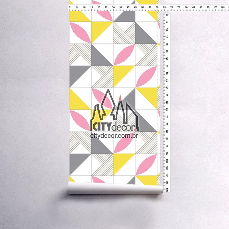 Papel de parede com estampa de azulejos estilo geométrico, inspirado na paleta da cor do ano Pantone 2021 – amarelo e cinza, simbolizando força e positividade. Disponível em duas opções de cores, com azulejos nos tamanhos 10 cm, 15 cm e 20 cm, para escolher conforme sua preferência