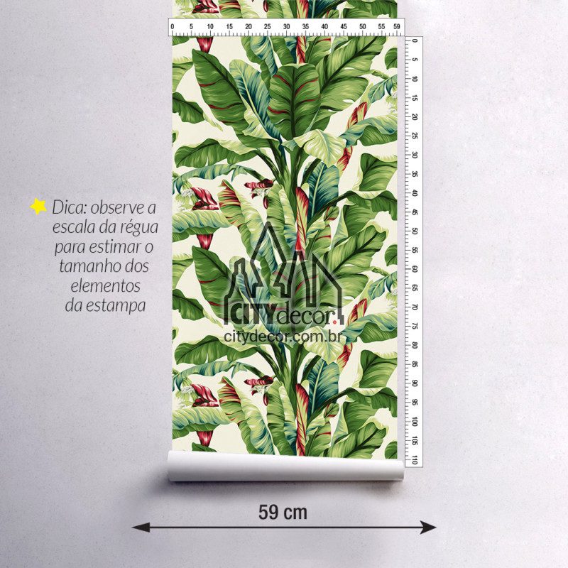 Com um design super diferenciado, este papel de parede de bananeira estilo tropical vai deixar o seu ambiente lindo, alegre e com uma sensação de frescor. Uma belíssima estampa, rica em cores e detalhes, ideal para decorar sala, cozinha, quarto, banheiro e lavabo. Cada coluna de folhas de bananeira tem aproximadamente 59 cm de largura.