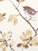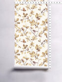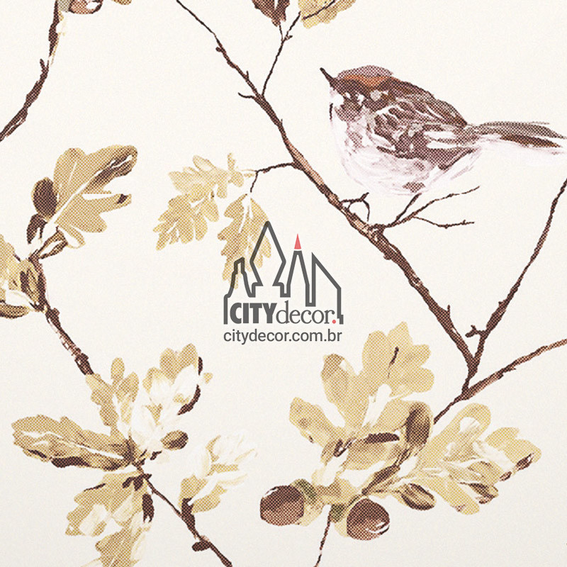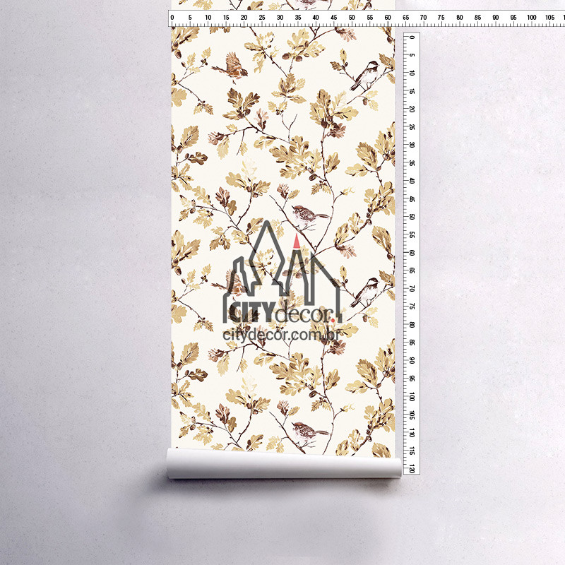 Este papel de parede apresenta uma estampa única de galhos de árvores com folhas, adornados com passarinhos, e conta com uma paleta de cores quentes e naturais, incluindo tons de marrom, verde oliva e um fundo bege claro, mais precisamente, um offwhite quente.