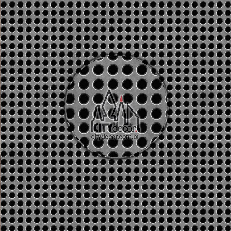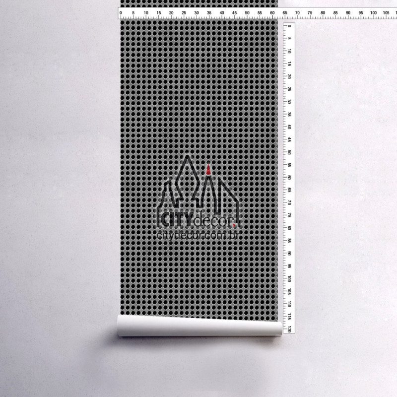 Papel de parede com estampa de chapa metálica perfurada na cor cinza, ideal para decoração de escritório, quarto masculino e ambientes modernos e minimalistas. Os furos têm 1,7 cm de diâmetro