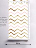 Com linhas finas e um tom delicado de rosa e dourado em fundo branco, esta estampa é perfeita para dar um toque feminino ao ambiente. Indicada tanto para decoração infantil como para quarto, escritório ou até mesmo fundo de cenários e vitrines. As linhas têm pouco mais de 2 cm de espessura e cada zig zag tem 10 cm de altura (da base até o pico)