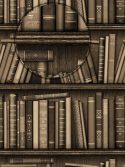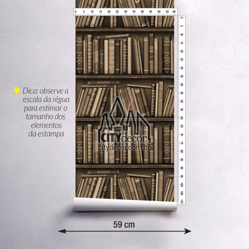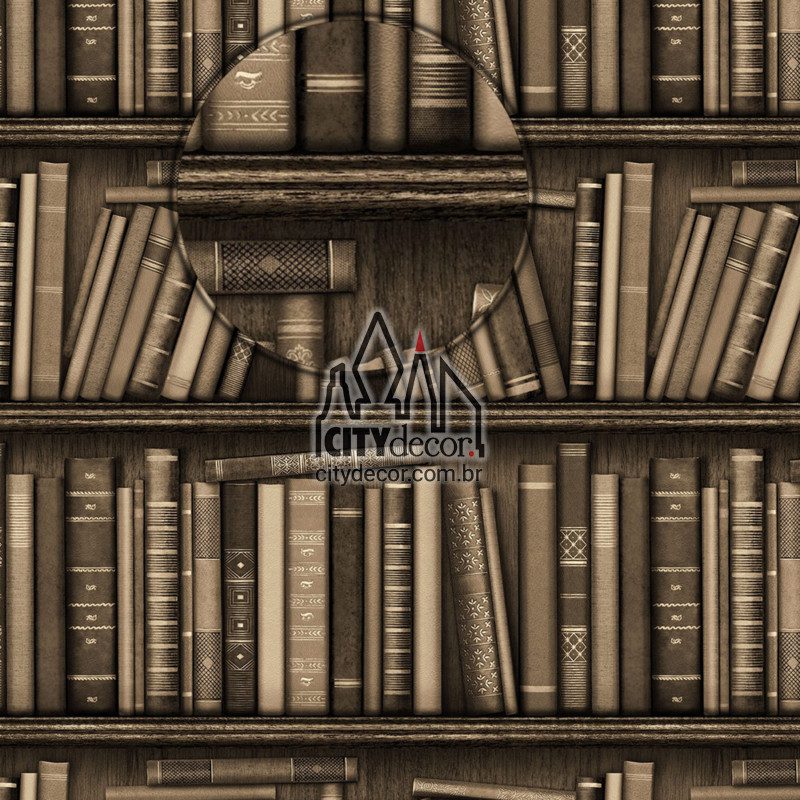 Papel de parede com estampa realística de livros em tons de sépia. Ideal para decoração de sala, escritório, quarto e cenário. Os livros se aproximam do tamanho real, medindo de 16 a 24 cm de altura