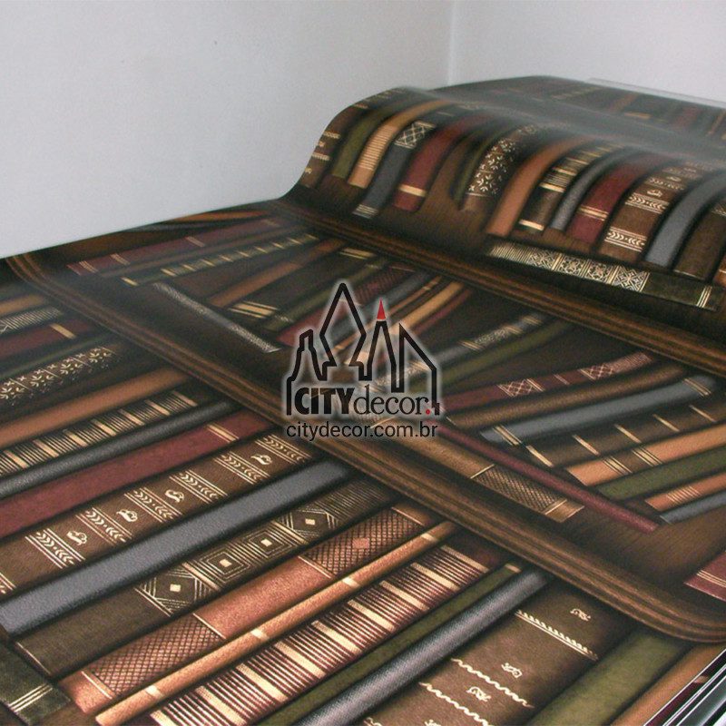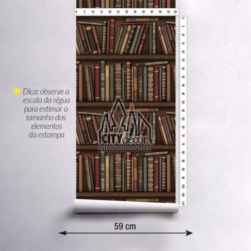 Papel de parede com estampa de livros de várias cores na estante de madeira. Ideal para decoração de sala, escritório, quarto e cenário. Os livros se aproximam do tamanho real, medindo de 16 a 24 cm de altura e as prateleiras da estante têm 25 cm de altura