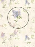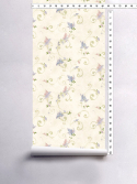 Papel de parede com estampa floral estilo clássico, com pequenos buquês de lavanda e arabescos em fundo bege. Os buquês têm aproximadamente 10 cm de comprimento