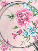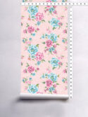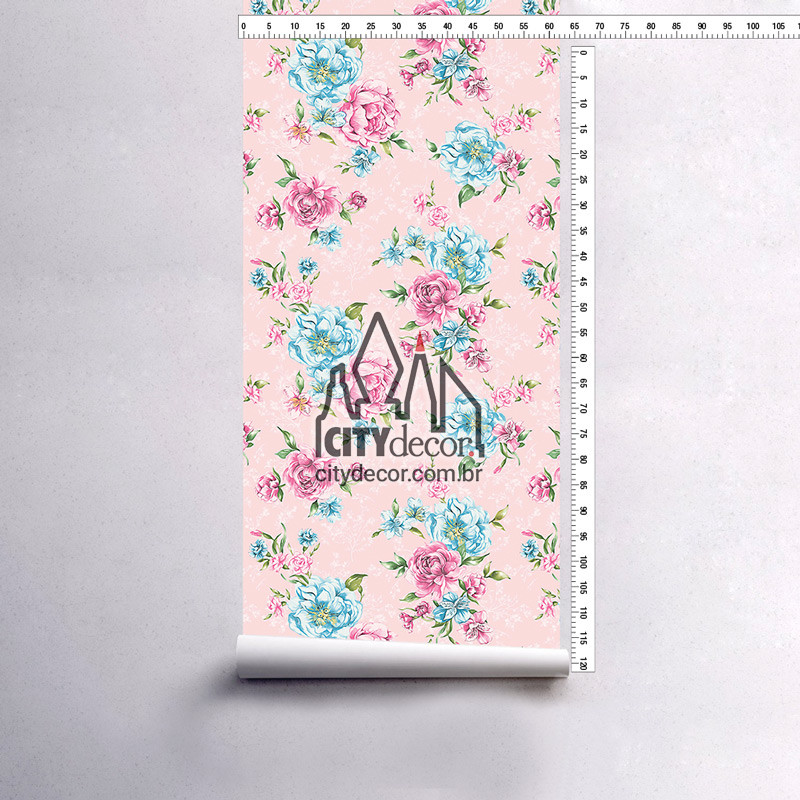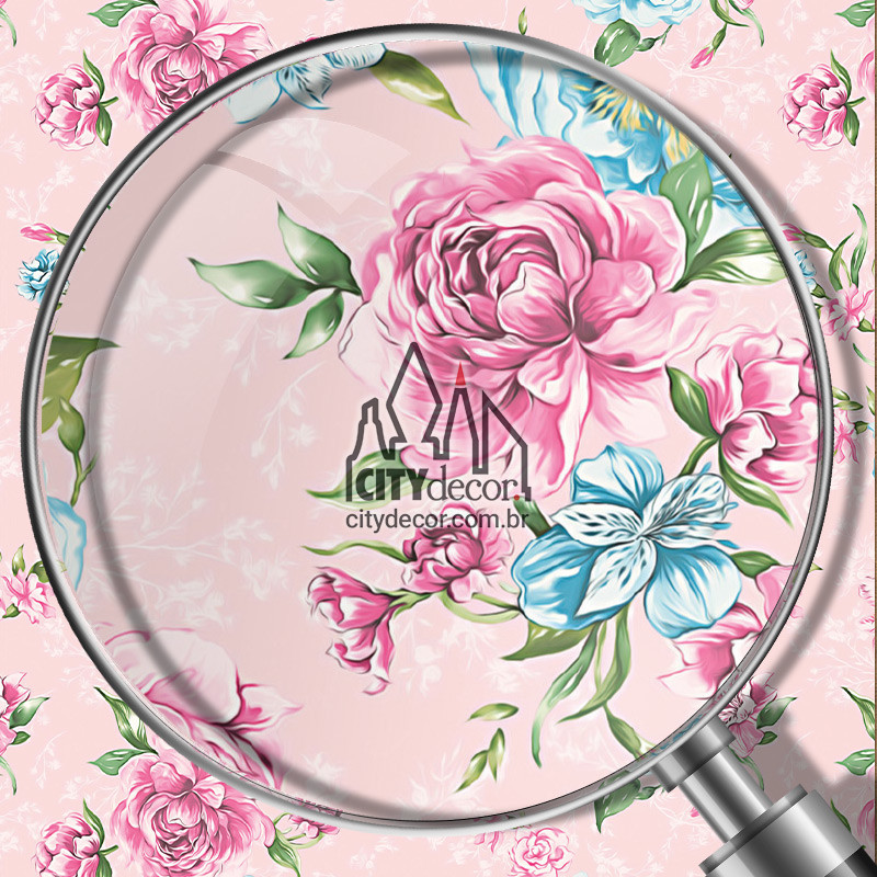 Transforme seu espaço em um oásis de serenidade e beleza com esta magnífica estampa floral que combina flores rosas e azuis em um fundo rosa claro, adicionando delicadeza e alegria aos ambientes.