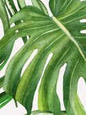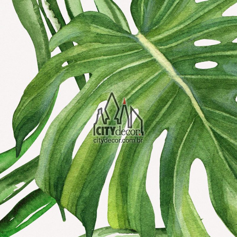 Crie uma atmosfera de frescor em seu ambiente com esta exuberante estampa de folhagens verdes e grandes de costela de adão em fundo bege bem claro. As folhas menores medem 35 cm e as maiores, 65 cm