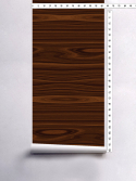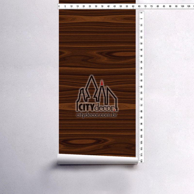Papel de parede com estampa de madeira de tonalidade castanha escura, com veios grandes e alongados na horizontal