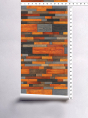 Papel de parede com estampa de mosaico de madeira filetada em tons de dourado, marrom, cinza e azul. Ótima opção para decorar escritório, sala e outros ambientes. Os menores filetes têm 4 cm de altura e os maiores 10 cm