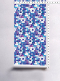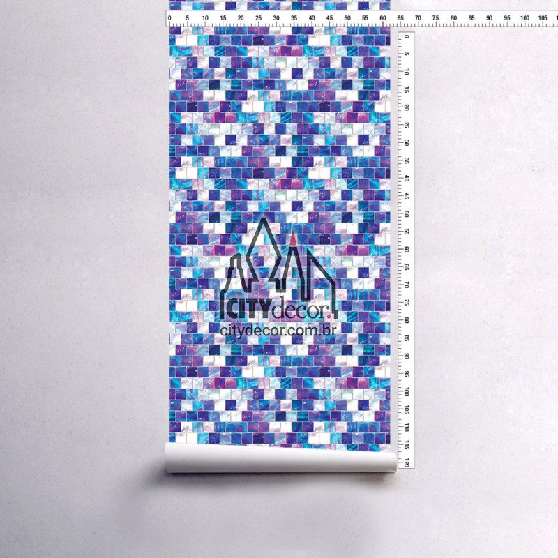 Adesivo papel de parede com estampa que imita pastilhas em tons de azul, lilás e branco, ideal para decoração de banheiro, lavabo, cozinha e outros ambientes. Cada pastilha mede 3 cm
