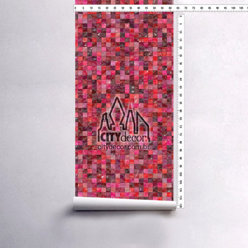 Adesivo papel de parede com estampa que imita pastilhas de vidro em tons de vermelho e rosa, ideal para decoração de banheiro, lavabo, cozinha e outros ambientes. Cada pastilha mede 3 cm