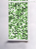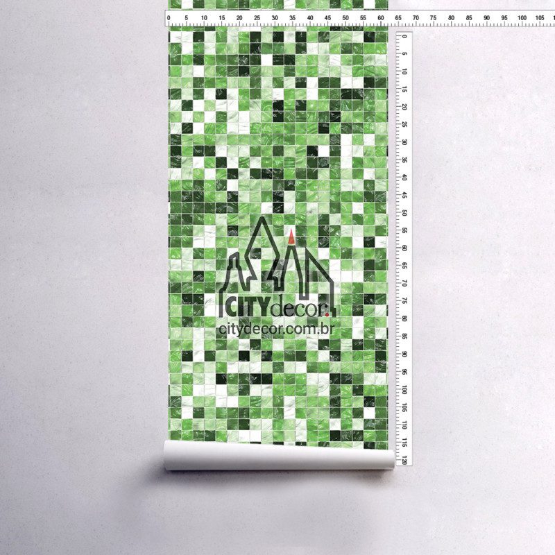 Adesivo papel de parede com estampa que imita pastilhas de vidro em tons de verde, ideal para decoração de banheiro, lavabo, cozinha e outros ambientes. Cada pastilha mede 3 cm