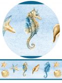 Faixa de parede com ilustração de cavalos marinhos, conchas e estrelas do mar em fundo azul claro. Possui 18 cm de altura, em rolos de 1,20 metros de comprimento, com encaixe perfeito da imagem nos pontos de emenda. Compre apenas a quantidade que precisar e montadas, as faixas parecem uma única peça contínua.