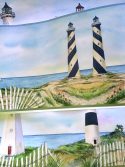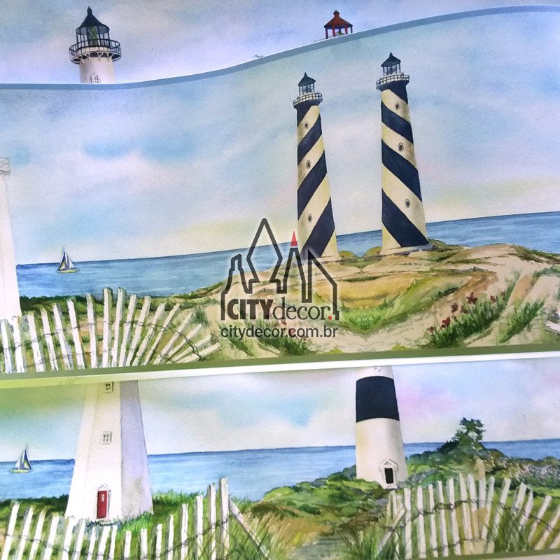 Faixa de parede com ilustração artística de praia com farol. Disponível nas versões 18 cm, 25 cm e 35 cm de altura, em rolos de 1,2 metros de comprimento, com encaixe perfeito da imagem nos pontos de emenda. Você compra a quantidade que precisar e quando montadas, as faixas vão parecer uma única peça contínua.