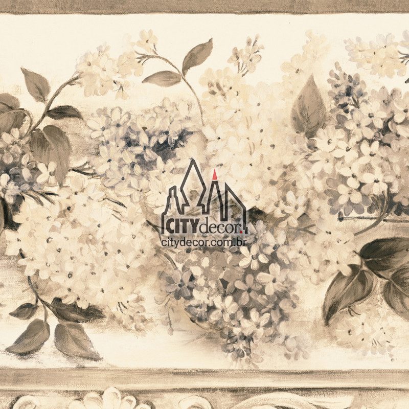 Faixa de parede com tema floral de pintura de hortênsias sobre tela. Disponível com 18 cm ou 25 cm de altura, em rolos de 1,20 metros de comprimento, com encaixe perfeito da imagem nos pontos de emenda. Compre apenas a quantidade que precisar e montadas, as faixas parecem uma única peça contínua.