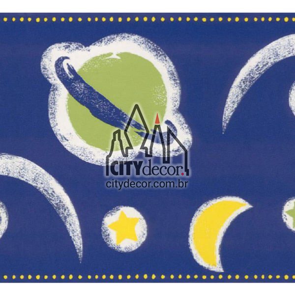 Faixa de parede infantil planetas e cometas, disponível com 18 cm de altura, em rolos de 1,2 metros de comprimento, com encaixe perfeito da imagem nos pontos de emenda. Você compra a quantidade que precisar e quando montadas, as faixas ficam como uma única peça contínua.